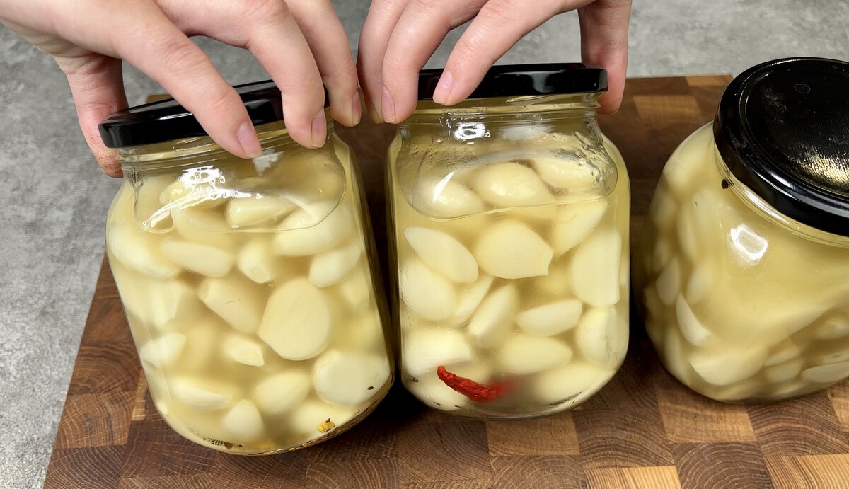 У стерильну банку покладіть часник, залийте гарячим маринадом, закрийте та щільно укутайте.